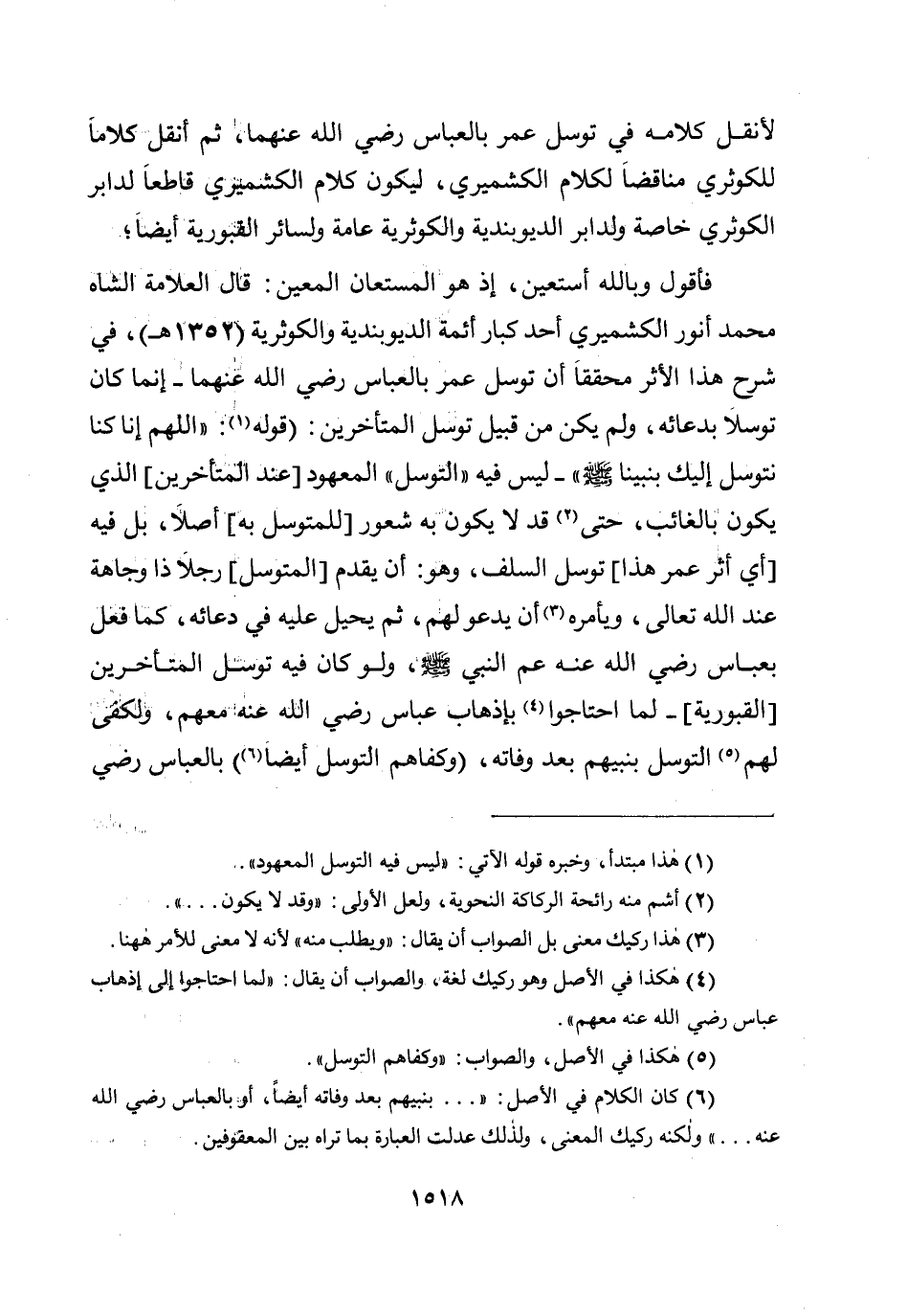 لأنقل كلامه في توسل عمر بالعباس رضي الله عنهما، ثم أنقل كلاماًَ للكوثري مناقضاً لكلام الكشميري، ليكون كلام الكشميري قاطعاً لدابر الكوثري خاصة ولدابر الديوبندية والكوثرية عامة، ولسائر القبورية أيضاً.