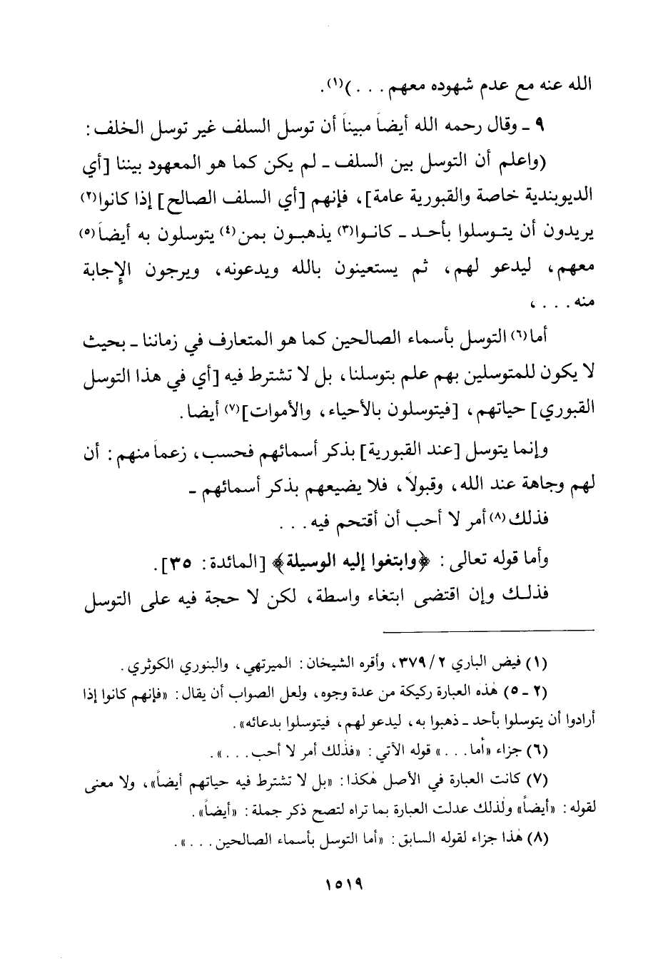 (واعلم أن التوسل بين السلف - لم يكن كما هو المعهود بيننا [أي الديوبندية خاصة والقبورية عامة] ، فإنهم [أي السلف الصالح] إذا كانوا يريدون أن يتوسلوا بأحد - كانوا يذهبون بمن يتوسلون به أيضاً معهم، ليدعو لهم، ثم يستعينون بالله ويدعونه، ويرجون الإجابة منه ... أما التوسل بأسماء الصالحين كما هو المتعارف في زماننا - بحيث لا يكون للمتوسلين بهم علم بتوسلنا، بل لا تشترط فيه [أي في هذا التوسل القبوري] حياتهم، [فيتوسلون بالأحياء والأموات] أيضاً.