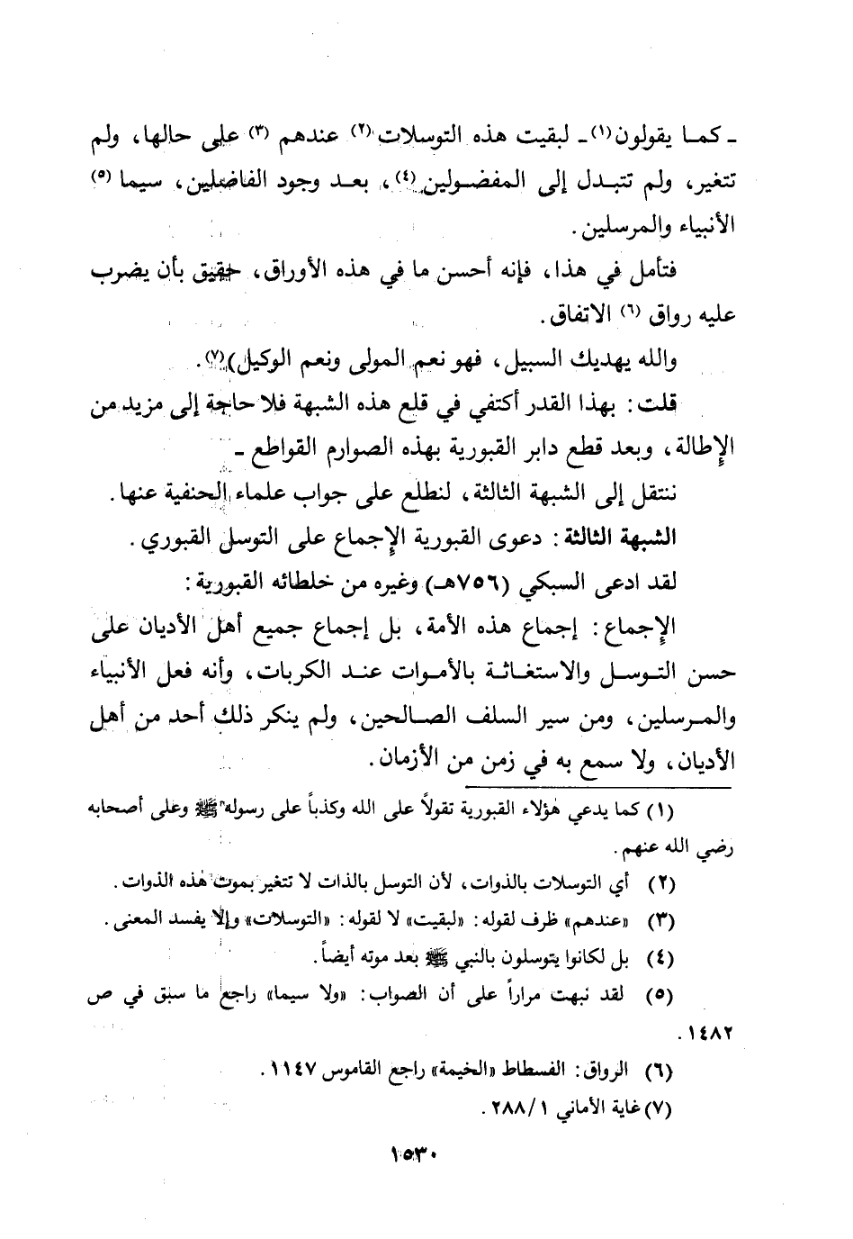 قلت: بهذا القدر أكتفى في قلع هذه الشبهة، فلا حاجة إلى مزيد من الإطالة، وبعد قطع دابر القبورية بهذه الصوارم القواطع - ننتقل إلى الشبهة الثالثة، لنطلع على جواب علماء الحنفية عنها.