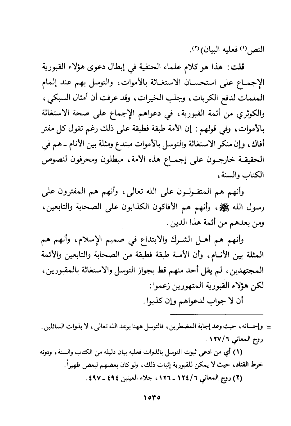 قلت: هذا هو كلام علماء الحنفية في إبطال دعوى هؤلاء القبورية الإجماع على استحسان الاستغاثة بالأموات، والتوسل بهم عند إلمام الملمات لدفع الكربات وجلب الخيرات، وقد عرفت أن أمثال السبكي والكوثري من أئمة القبورية، في دعواهم الإجماع على صحة الاستغاثة بالأموات، وفي قولهم: إن الأمة طبقة فطبقة على ذلك رغم تقول كل مفتر أفاك، وإن منكر الاستغاثة والتوسل بالأموات مبتدع ومثلة بين الأنام - هم في الحقيقة خارجون على إجماع هذه الأمة، مبطلون ومحرفون لنصوص الكتاب والسنة، وأنهم هم المتقولون على الله تعالى، وأنهم هم المفترون على رسول الله صلى الله عليه وسلم، وأنهم هم الأفاكون الكذابون على الصحابة والتابعين، ومن بعدهم من أئمة هذا الدين.