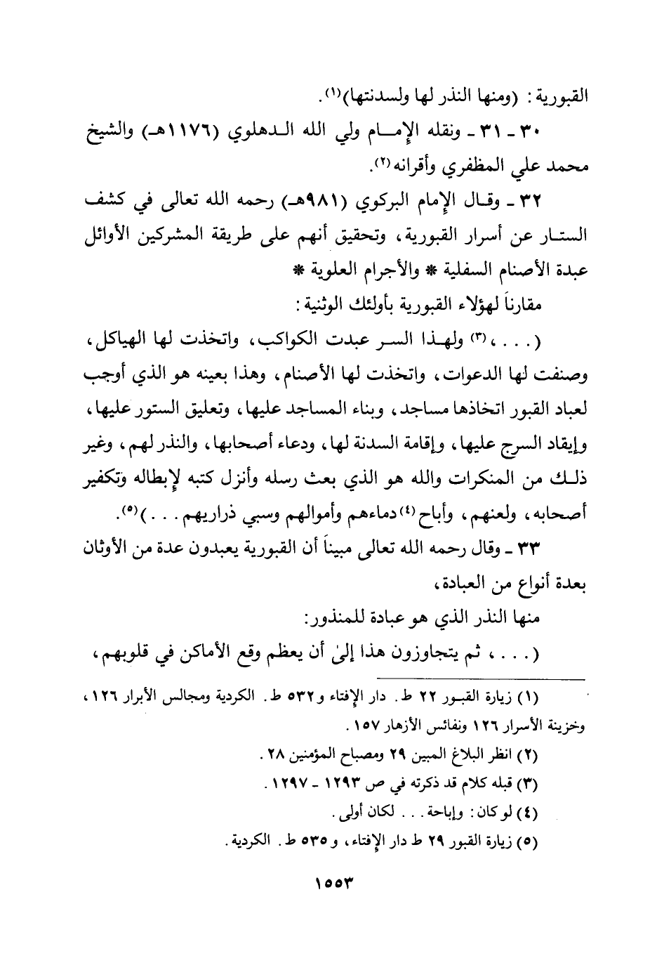 32 - وقال الإمام البركوي (981هـ) رحمه الله تعالى في كشف الستار عن أسرار القبورية، وتحقيق أنهم على طريقة المشركين الأوائل عبدة الأصنام السفلية * والأجرام العلوية * مقارناً لهؤلاء القبورية بأولئك الوثنية:
