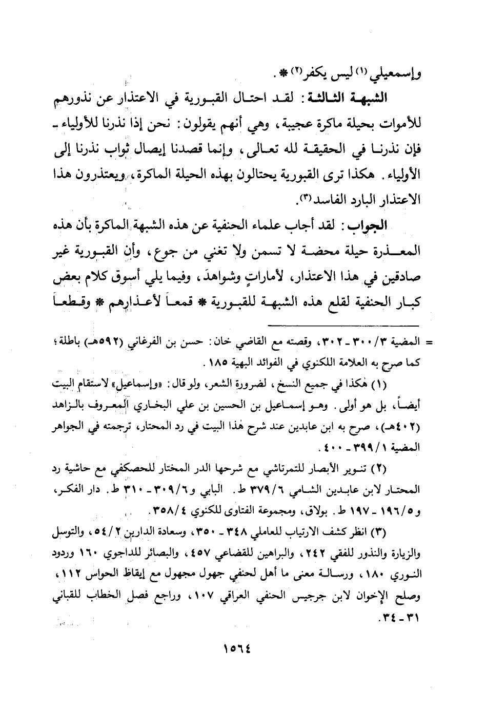 الجواب: لقد أجاب علماء الحنفية عن هذه الشبهة الماكرة بأن هذه المعذرة حيلة محضة لا تسمن ولا تغني من جوع، وأن القبورية غير صادقين في هذا الاعتذار، لأمارات وشواهد، وفيما يلي أسوق كلام بعض كبار الحنفية لقلع هذه الشبهة للقبورية * قمعاً لأعذارهم * وقطعا