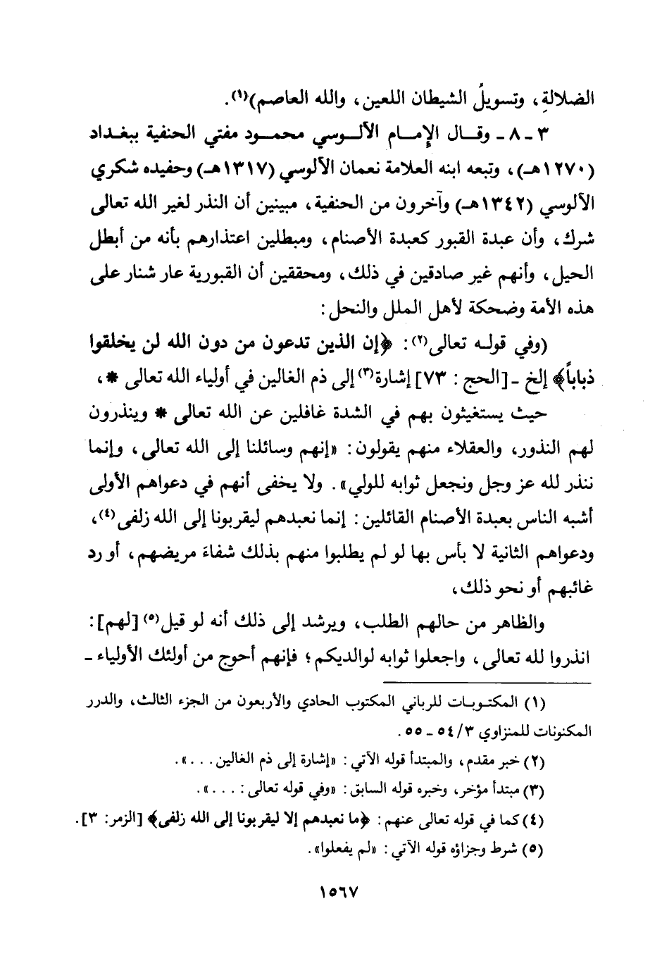 3 -8- وقال الإمام الآلوسي محمود، مفتي الحنفية ببغداد (1270هـ) ، وتبعه ابنه العلامة نعمان الآلوسي (1317هـ) وحفيده شكري الآلوسي (1342هـ) وآخرون من الحنفية، مبينين أن النذر لغير الله تعالى شرك، وأن عبدة القبور كعبدة الأصنام، ومبطلين اعتذارهم بأنه من أبطل الحيل، وأنهم غير صادقين في ذلك، ومحققين أن القبورية عار شنار على هذه الأمة وضحكة لأهل الملل والنحل: