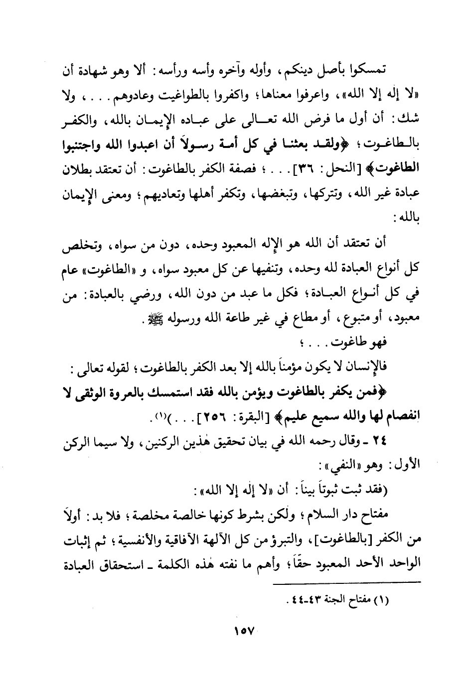 مفتاح دار السلام؛ ولكن بشرط كونها خالصة مخلصة؛ فلا بد أولًا من الكفر [بالطاغوت] ، والتبرؤ من كل الآلهة الآفاقية والأنفسية؛ ثم إثبات الواحد الأحد المعبود حقا؛ وأهم ما نفته هذه الكلمة - استحقاق العبادة