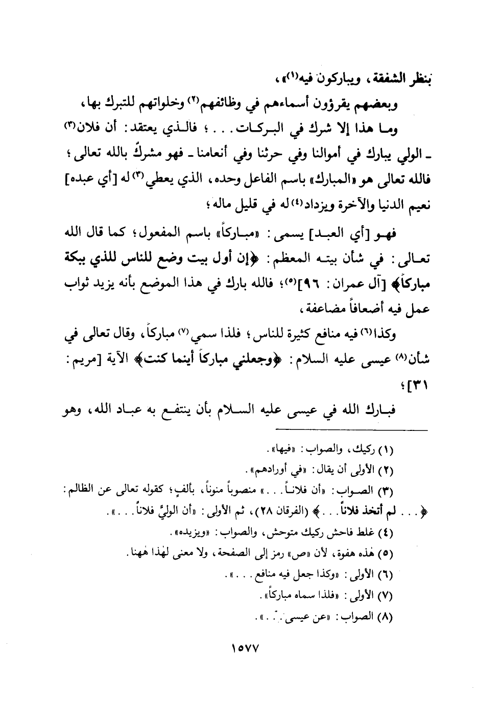 بنظر الشفقة، ويباركون فيه)) ، وبعضهم يقرءون أسماءهم في وظائفهم وخلواتهم للتبرك بها، وما هذا إلا شرك في البركات.... فالذي يعتقد: أن فلان - الولي يبارك في أموالنا وفي حرثنا وفي أنعامنا - فهو مشرك بالله تعالى؛ فالله تعالى هو ((المبارك)) باسم الفاعل وحده، الذي يعطي له [أي عبده] نعيم الدنيا والآخرة ويزداد له في قليل ماله؛ فهو [أي العبد] يسمى: ((مباركاً)) باسم المفعول؛ كما قال الله تعالى: في شأن بيته المعظم: {إِنَّ أَوَّلَ بَيْتٍ وُضِعَ لِلنَّاسِ لَلَّذِي بِبَكَّةَ مُبَارَكًا} [آل عمران: 96] ؛ فالله بارك في هذا الموضع بأنه يزيد ثواب عمل فيه أضعافاً مضاعفة، وكذا فيه منافع كثيرة للناس؛ فلذا سمي مباركاً، وقال تعالى في شأن عيسى عليه السلام: {وَجَعَلَنِي مُبَارَكًا أَيْنَ مَا كُنْتُ} الآية [مريم: 31] ؛ فبارك الله في عيسى عليه السلام بأن ينتفع به عباد الله، وهو