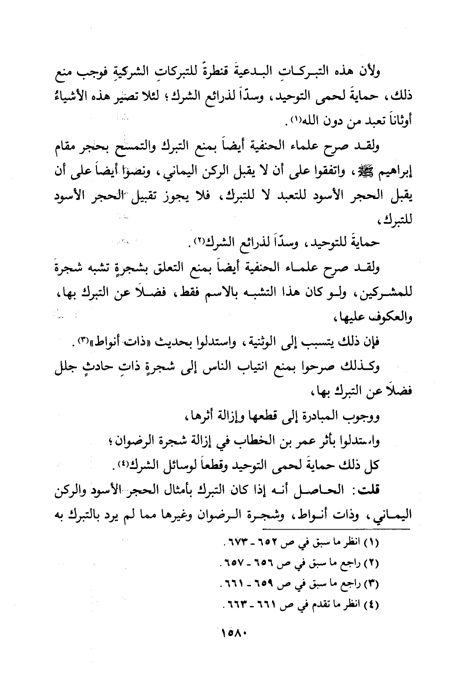 وكذلك صرحوا بمنع انتياب الناس إلى شجرة ذات حادث جلل فضلاً عن التبرك بها، ووجوب المبادرة إلى قطعها وإزالة أثرها، واستدلوا بأثر عمر بن الخطاب في إزالة شجرة الرضوان؛ كل ذلك حماية لحمى التوحيد وقطعاً لوسائل الشرك.