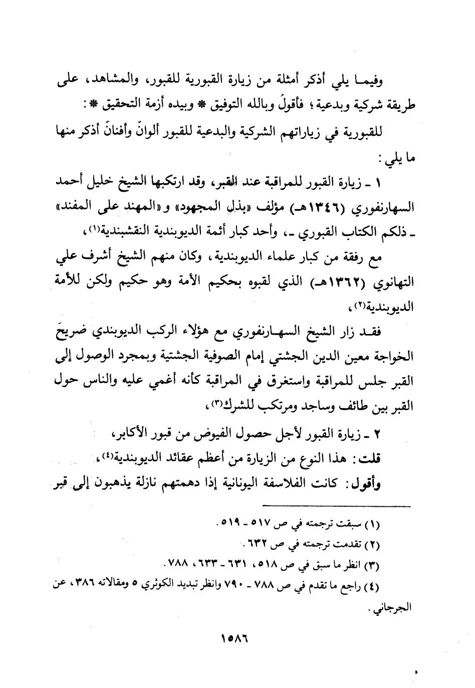 1 - زيارة القبور للمراقبة عند القبر، وقد ارتكبها الشيخ خليل أحمد السهارنفوري (1346هـ) مؤلف ((بذل المجهود)) و ((المهند على المفند)) - ذلكم الكتاب القبوري - وأحد كبار أئمة الديوبندية النقشبندية، مع رفقة من كبار علماء الديوبندية، وكان منهم الشيخ أشرف علي التهانوي (1362هـ) الذي لقبوه بحكيم الأمة، وهو حكيم ولكن للأمة الديوبندية.