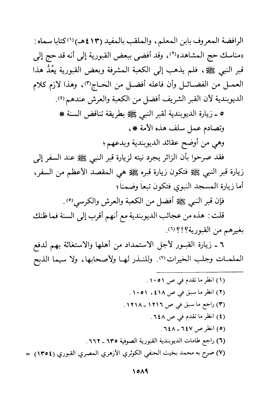 الرافضة، المعروف بابن المعلم، والملقب بالمفيد (413هـ) كتابا سماه: ((مناسك حج المشاهد)) ، وقد أفضى ببعض القبورية إلى أنه قد حج إلى قبر النبي صلى الله عليه وسلم، فلم يذهب إلى الكعبة المشرفة، وبعض القبورية يعد هذا العمل من الفضائل وأن فاعله أفضل من الحاج، وهذا لازم كلام الديوبندية لأن القبر الشريف أفضل من الكعبة والعرش عندهم.