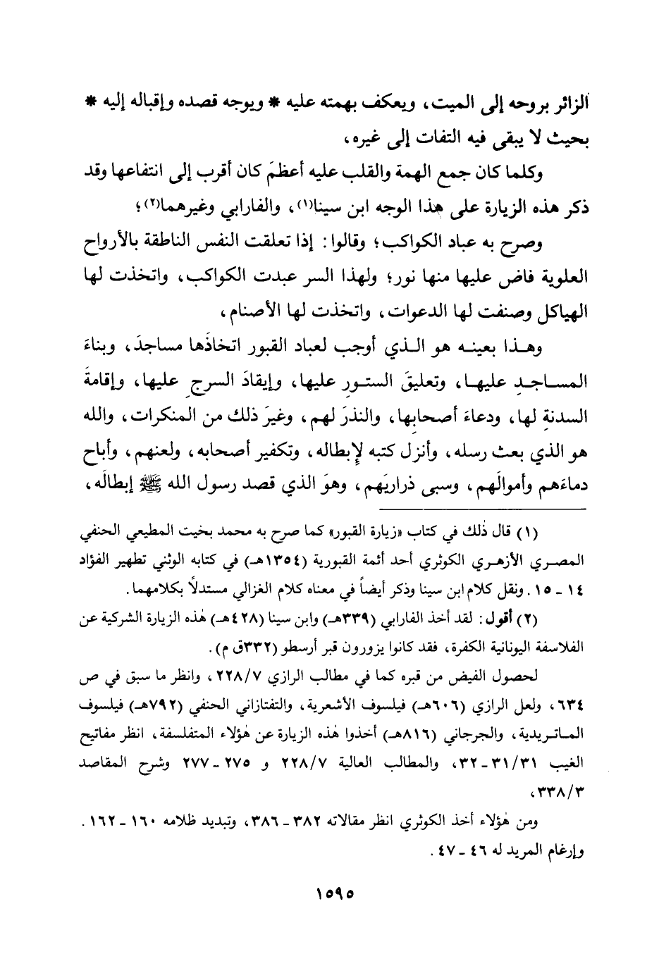 الزائر بروحه إلى الميت، ويعكف بهمته عليه * ويوجه قصده وإقباله إليه * بحيث لا يبقى فيه التفات إلى غيره، وكلما كان جمع الهمة والقلب عليه أعظم كان أقرب إلى انتفاعها، وقد ذكر هذه الزيارة على هذا الوجه ابن سينا، والفارابي وغيرهما؛ وصرح به عباد الكواكب؛ وقالوا: إذا تعلقت النفس الناطقة بالأرواح العلوية فاض عليها منها نور؛ ولهذا السر عبدت الكواكب، واتخذت لها الهياكل وصنفت لها الدعوات، واتخذت لها الأصنام، وهذا بعينه هو الذي أوجب لعباد القبور اتخاذها مساجد، وبناء المساجد عليها، وتعليق الستور عليها، وإيقاد السرج عليها، وإقامة السدنة لها، ودعاء أصحابها، والنذر لهم، وغير ذلك من المنكرات، والله هو الذي بعث رسله، وأنزل كتبه لإبطاله، وتكفير أصحابه، ولعنهم، وأباح دماءهم وأموالهم، وسبى ذراريهم، وهو الذي قصد رسول الله صلى الله عليه وسلم إبطاله،