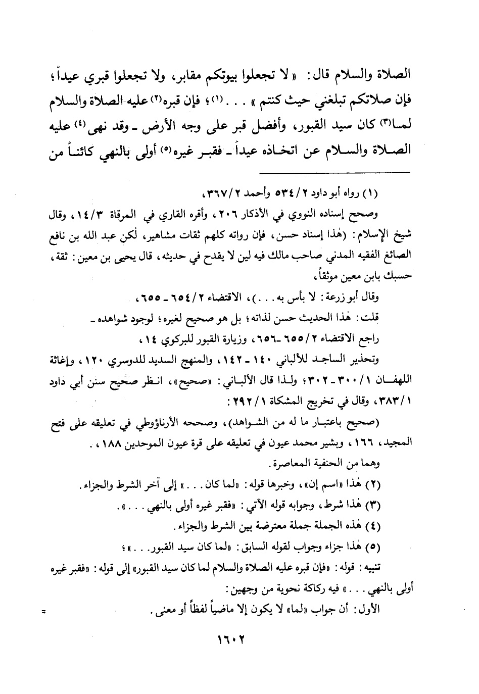 الصلاة والسلام قال: (( «لا تجعلوا بيوتكم مقابر، ولا تجعلوا قبري عيداً؛ فإن صلاتكم تبلغني حيث كنتم» )) ......... فإن قبره عليه الصلاة والسلام لما كان سيد القبور، وأفضل قبر على وجه الأرض - وقد نهى عليه الصلاة والسلام عن اتخاذه عيداًَ - فقبر غيره أولى بالنهي كائناً من
