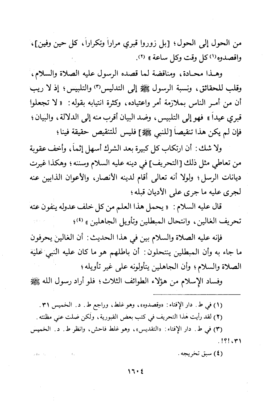وهذا محادة ومناقضة لما قصده الرسول عليه الصلاة والسلام، وقلب للحقائق، ونسبة الرسول صلى الله عليه وسلم إلى التدليس والتلبيس؛ إذ لا ريب أن من أمر الناس بملازمة أمر واعتياده، وكثرة انتيابه بقوله: (( «لا تجعلوا قبري عيداً» )) فهو إلى التلبيس، وضد البيان أقرب منه إلى الدلالة والبيان؛ فإن لم يكن هذا تنقيصاً [للنبي صلى الله عليه وسلم] فليس للتنقيص حقيقة فينا؛ ولا شك أن ارتكاب كل كبيرة بعد الشرك أسهل إثماً، وأخف عقوبة من تعاطي مثل ذلك [التحريف] في دينه عليه السلام وسننه؛ وهكذا غيرت ديانات الرسل؛ ولولا أنه تعالى أقام لدينه الأنصار والأعوان الذابين عنه لجرى عليه ما جرى على الأديان قبله؛ قال عليه السلام: (( «يحمل هذا العلم من كل خلف عدوله، ينفون عنه تحريف الغالين، وانتحال المبطلين وتأويل الجاهلين» )) ؛ فإنه عليه الصلاة والسلام بين في هذا الحديث: أن الغالين يحرفون ما جاء به وأن المبطلين ينتحلون أن باطلهم هو ما كان عليه النبي عليه الصلاة والسلام؛ وأن الجاهلين يتأولونه على غير تأويله؛ وفساد الإسلام من هؤلاء الطوائف الثلاث؛ فلو أراد رسول الله صلى الله عليه وسلم