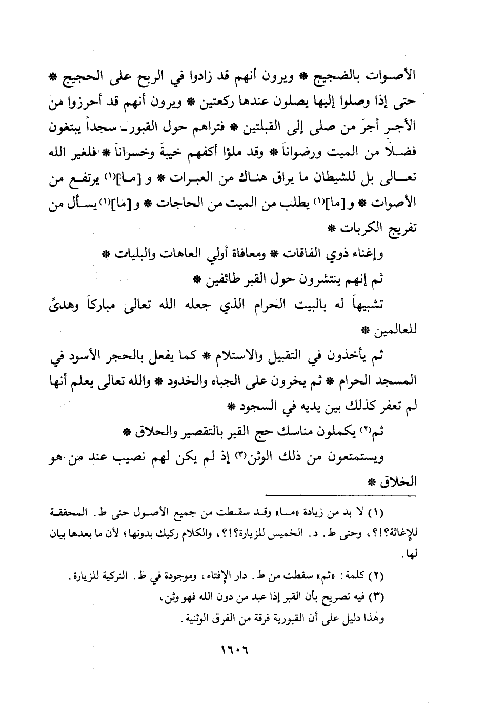 حتى إذا وصلوا إليها يصلون عندها ركعتين * ويرون أنهم قد أحرزوا من الأجر أجر من صلى إلى القبلتين * فتراهم حول القبور - سجداً يبتغون فضلاً من الميت ورضواناً * وقد ملؤا أكفهم خيبة وخسراناً * فلغير الله تعالى بل للشيطان ما يراق هناك من العبرات * و [ما] يرتفع من الأصوات * و [ما] يطلب من الميت من الحاجات * و [ما] يسأل من تفريج الكربات * وإغناء ذوي الفاقات * ومعافاة أولي العاهات والبليات *.