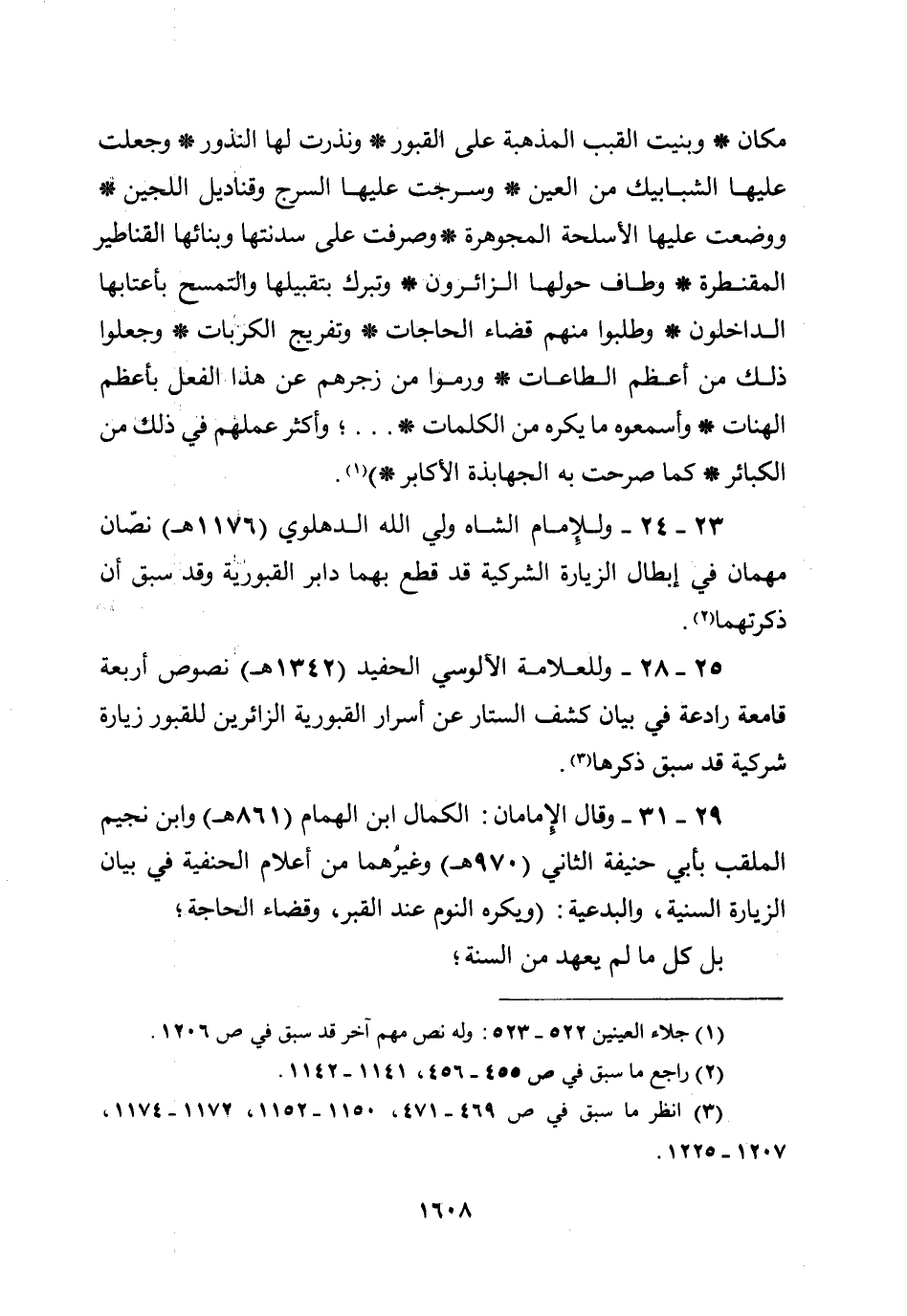 23-24- وللإمام الشاه ولي الله الدهلوي (1176هـ) نصان مهمان في إبطال الزيارة الشركية قد قطع بهما دابر القبورية، وقد سبق أن ذكرتهما.