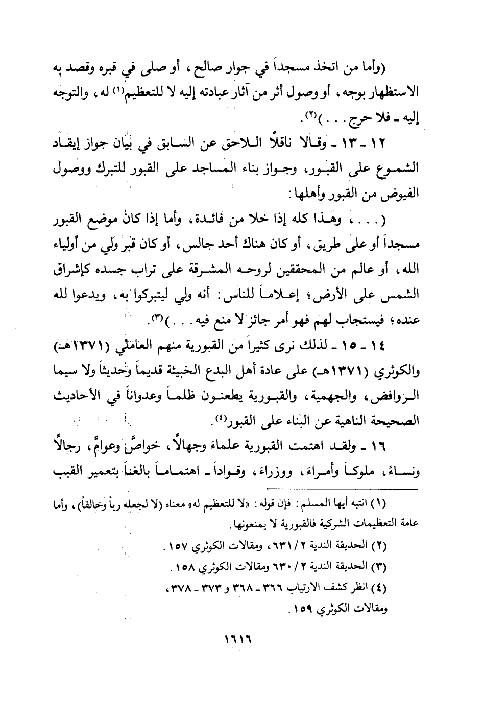 14 -15- لذلك نرى كثيراً من القبورية، منهم العاملي (1371هـ) والكوثري (1371هـ) على عادة أهل البدع الخبيثة قديماً وحديثاً، ولا سيما الروافض والجهمية والقبورية، يطعنون ظلماً وعدواناًَ في الأحاديث الصحيحة الناهية عن البناء على القبور.