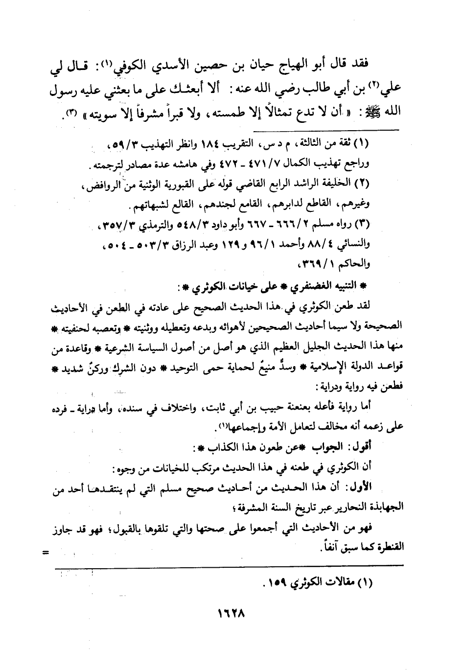 فقد «قال أبو الهياج حيان بن حصين الأسدي الكوفي: قال لي علي بن أبي طالب رضي الله عنه: ألا أبعثك على ما بعثني عليه رسول الله صلى الله عليه وسلم: ((أن لا تدع تمثالاً إلا طمسته، ولا قبراً مشرفاًَ إلا سويته)) » .