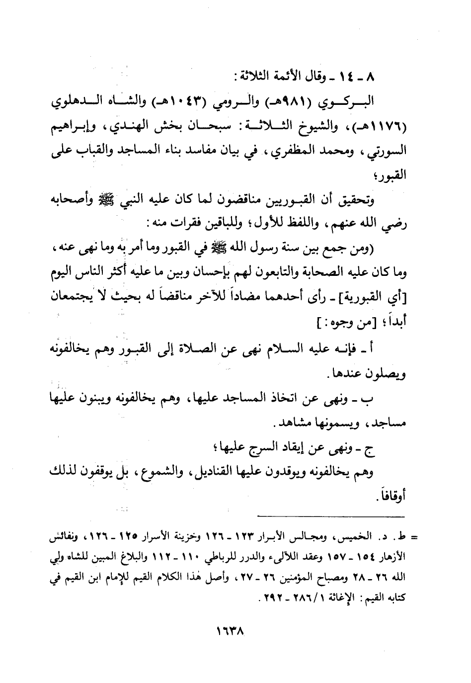 8 -14- وقال الأئمة الثلاثة: البركوي (981هـ) والرومي (1043هـ) والشاه الدهلوي (1176هـ) ، والشيوخ الثلاثة: سبحان بخش الهندي، وإبراهيم السورتي، ومحمد المظفري، في بيان مفاسد بناء المساجد والقباب على القبور؛ وتحقيق أن القبوريين مناقضون لما كان عليه النبي صلى الله عليه وسلم وأصحابه رضي الله عنهم، واللفظ للأول؛ وللباقين فقرات منه: