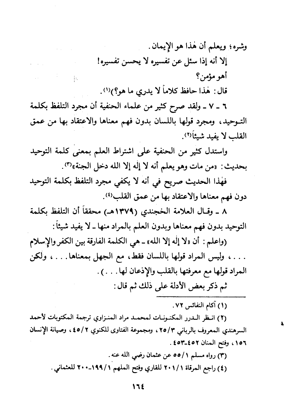 6 - 7 - ولقد صرح كثير من علماء الحنفية أن مجرد التلفظ بكلمة التوحيد؛ ومجرد قولها باللسان بدون فهم معناها والاعتقاد بها من عمق القلب لا يفيد شيئًا.