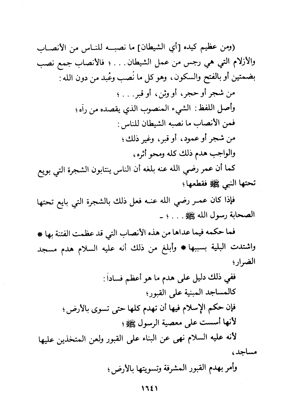 وأصل اللفظ: الشيء المنصوب الذين يقصده من رآه؛ فمن الأنصاب ما نصبه الشيطان للناس: من شجر أو عمود، أو قبر، وغير ذلك؛ والواجب هدم ذلك كله ومحو أثره، كما أن عمر رضي الله عنه بلغه أن الناس ينتابون الشجرة التي بويع تحتها النبي صلى الله عليه وسلم فقطعها؛ فإذا كان عمر رضي الله عنه فعل ذلك بالشجرة التي بايع تحتها الصحابة رسول الله صلى الله عليه وسلم.... - فما حكمه فيما عداها من هذه الأنصاب التي قد عظمت الفتنة بها * واشتدت البلية بسببها * وأبلغ من ذلك أنه عليه السلام هدم مسجد الضرار؛ ففي ذلك دليل على هدم ما هو أعظم فساداً: كالمساجد المبنية على القبور؛ فإن حكم الإسلام فيها أن تهدم كلها حتى تسوى بالأرض؛ لأنها أسست على معصية الرسول صلى الله عليه وسلم؛ لأنه عليه السلام نهى عن البناء على القبور ولعن المتخذين عليها مساجد، وأمر بهدم القبور المشرفة وتسويتها بالأرض؛