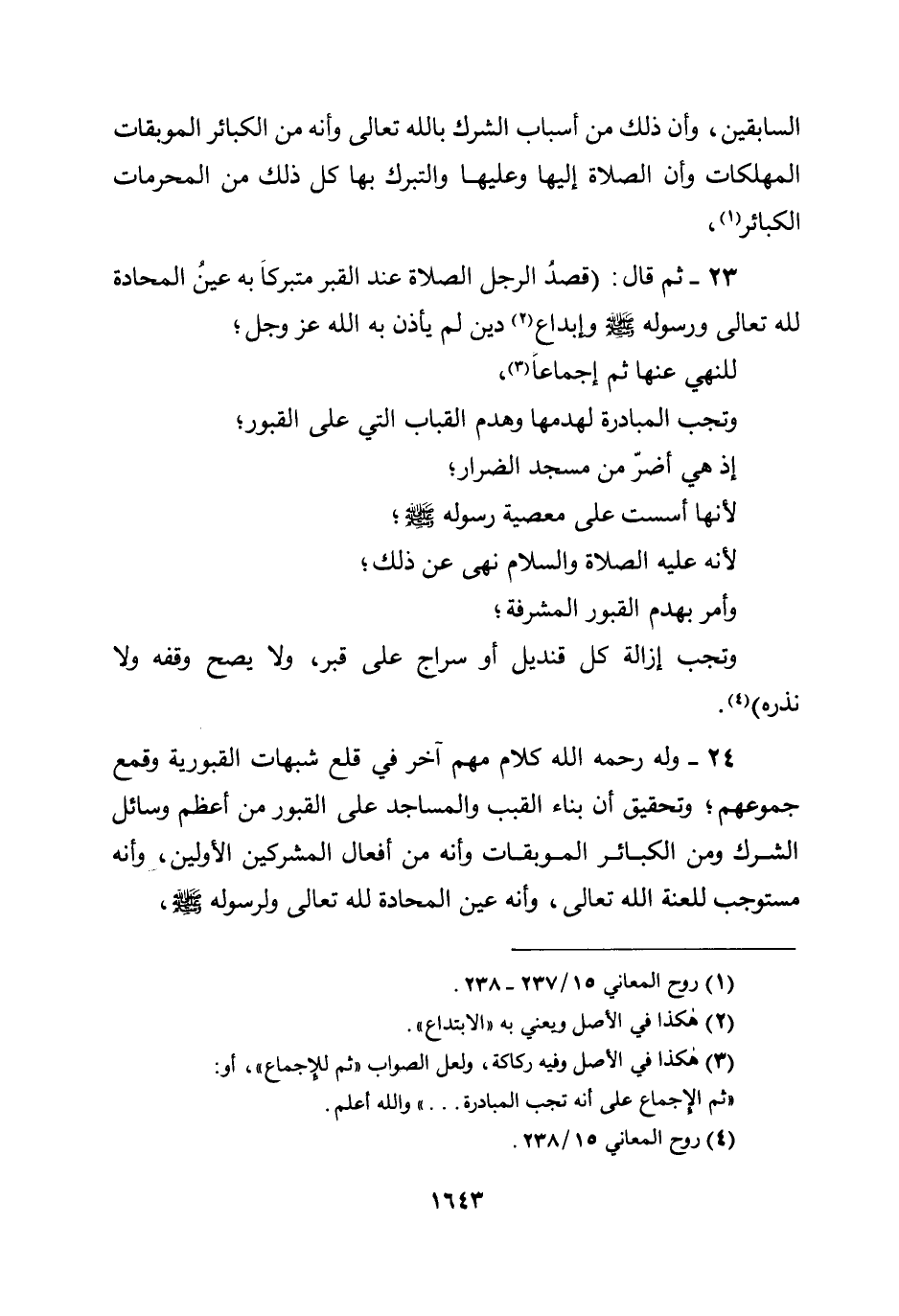 24 - وله رحمه الله كلام مهم آخر في قلع شبهات القبورية وقمع جموعهم؛ وتحقيق أن بناء القبب والمساجد على القبور من أعظم وسائل الشرك ومن الكبائر المبوقات وأنه من أفعال المشركين الأولين، وأنه مستوجب للعنة الله تعالى، وأنه عين المحادة لله تعالى ولرسوله صلى الله عليه وسلم،