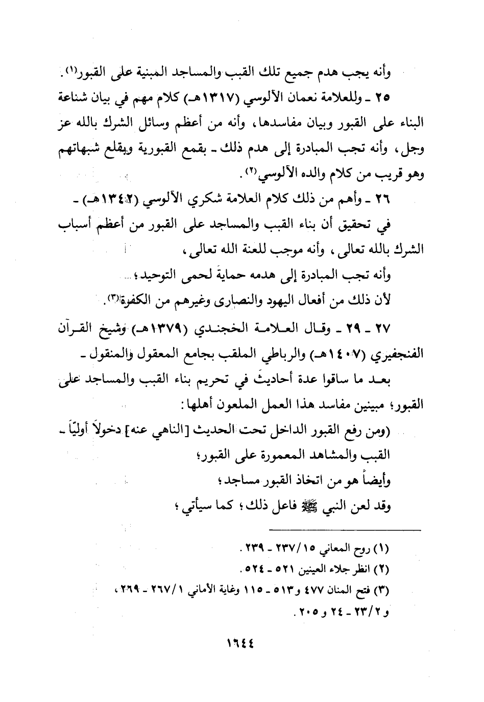26 - وأهم من ذلك كلام العلامة شكري الآلوسي (1342هـ) - في تحقيق أن بناء القبب والمساجد على القبور من أعظم أسباب الشرك بالله تعالى، وأنه موجب للعنة الله تعالى، وأنه تجب المبادرة إلى هدمه حماية لحمى التوحيد؛ لأن ذلك من أفعال اليهود والنصارى وغيرهم من الكفرة.
