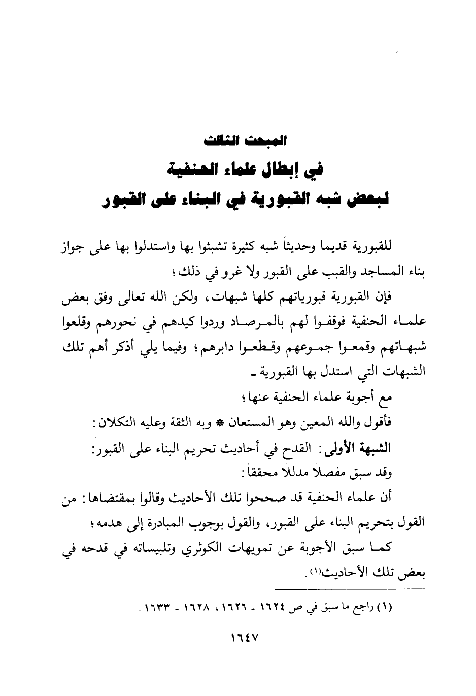 وقد سبق مفصلاً مدللاً محققاً أن علماء الحنفية قد صححوا تلك الأحاديث وقالوا بمقتضاها، من القول بتحريم البناء على القبور، والقول بوجوب المبادرة إلى هدمه؛ كما سبق الأجوبة عن تمويهات الكوثري وتلبيساته في قدحه في بعض تلك الأحاديث.