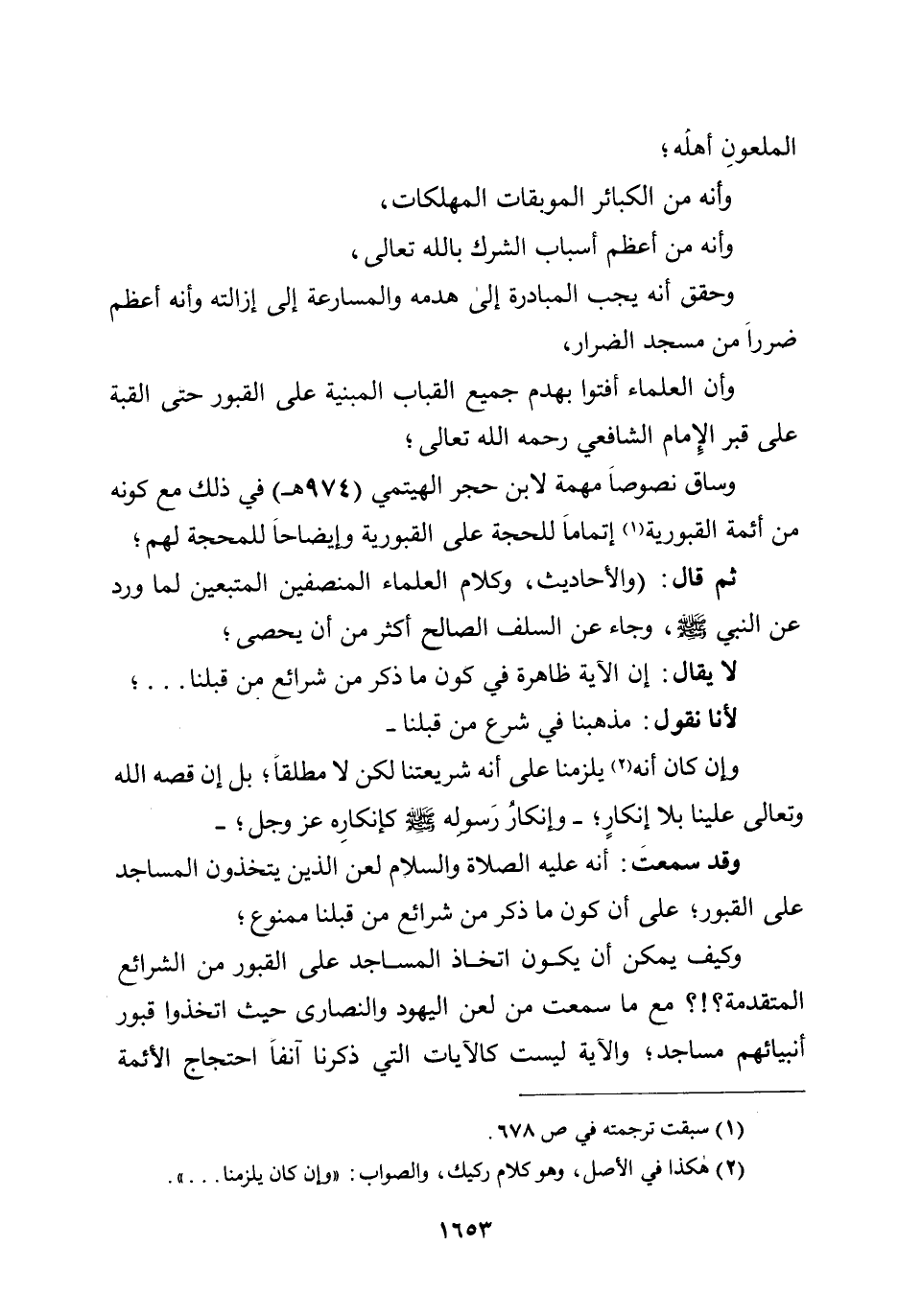 المعلون أهله؛ وأنه من الكبائر الموبقات المهلكات، وأنه من أعظم أسباب الشرك بالله تعالى، وحقق أنه يجب المبادرة إلى هدمه والمسارعة إلى إزالته، وأنه أعظم ضرراً من مسجد الضرار، وأن العلماء أفتوا بهدم جميع القباب المبنية على القبور حتى القبة على قبر الإمام الشافعي رحمه الله تعالى؛ وساق نصوصاً مهمة لابن حجر الهيتمي (974هـ) في ذلك مع كونه من أئمة القبورية إتماماًَ للحجة على القبورية وإيضاحاً للمحجة لهم؛ ثم قال: (والأحاديث، وكلام العلماء المنصفين المتبعين لما ورد عن النبي صلى الله عليه وسلم وجاء عن السلف الصالح أكثر من أن يحصى.