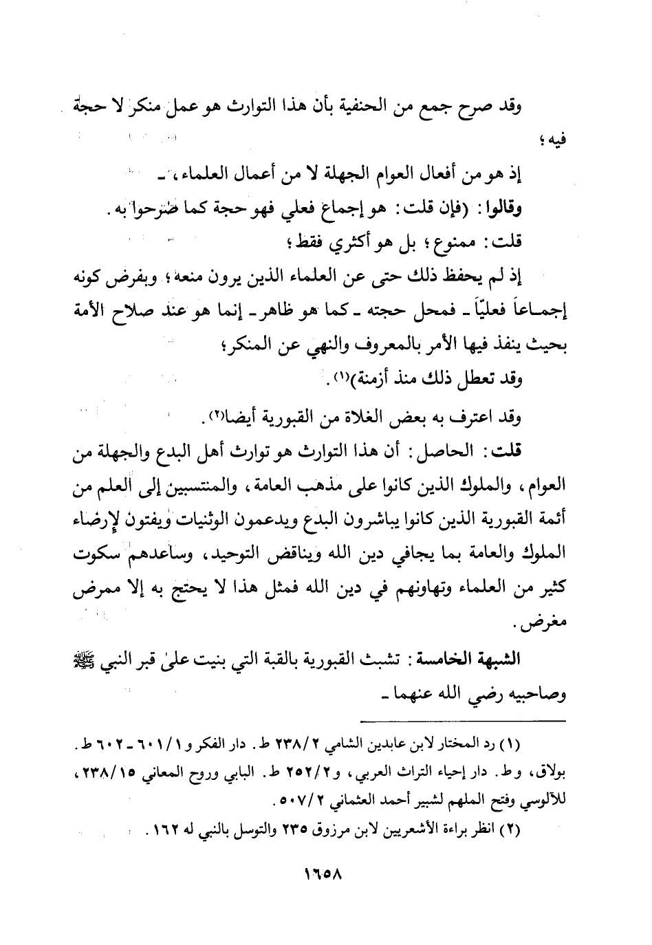 قلت: الحاصل: أن هذا التوارث هو توارث أهل البدع والجهلة من العوام والملوك الذين كانوا على مذهب العامة، والمنتسبين إلى العلم من أئمة القبورية الذين كانوا يباشرون البدع ويدعمون الوثنيات ويفتون لإرضاء الملوك والعامة بما يجافي دين الله ويناقض التوحيد، وساعدهم سكوت كثير من العلماء وتهاونهم في دين الله، فمثل هذا لا يحتج به إلا ممرض مغرض.