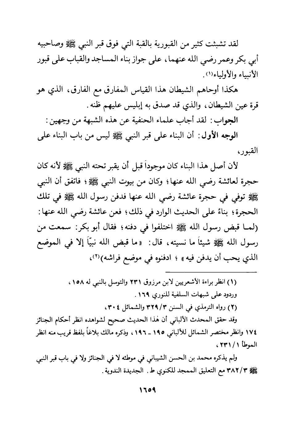الوجه الأول: أن البناء على قبر النبي صلى الله عليه وسلم ليس من باب البناء على القبور، لأن أصل هذا البناء كان موجوداً قبل أن يقبر تحته النبي صلى الله عليه وسلم لأنه كان حجرة لعائشة رضي الله عنها؛ وكان من بيوت النبي صلى الله عليه وسلم؛ فاتفق أن النبي صلى الله عليه وسلم توفي في حجرة عائشة رضي الله عنها فدفن رسول الله صلى الله عليه وسلم في تلك الحجرة؛ بناءً على الحديث الوارد في ذلك؛ فعن عائشة رضي الله عنها: ( «لما قبض رسول الله صلى الله عليه وسلم اختلفوا في دفنه؛ فقال أبو بكر: سمعت من رسول الله صلى الله عليه وسلم شيئاً ما نسيته، قال: ((ما قبض الله نبياً إلا في الموضع الذي يحب أن يدفن فيه)) ؛ ادفنوه في موضع فراشه» ) ،