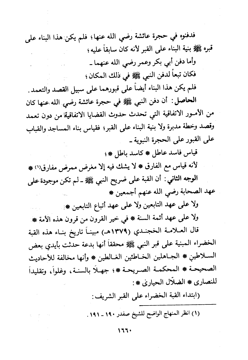 الحاصل: أن دفن النبي صلى الله عليه وسلم في حجرة عائشة رضي الله عنها، كان من الأمور الاتفاقية التي تحدث حدوث القضايا الاتفاقية من دون تعمد وقصد وخطة مدبرة، ولا بنية البناء على القبر؛ فقياس بناء المساجد والقباب على القبور على الحجرة النبوية - قياس فاسد عاطل * كاسد باطل *؛ لأنه قياس مع الفارق * لا يشك فيه إلا مغرض ممرض مفارق *.
