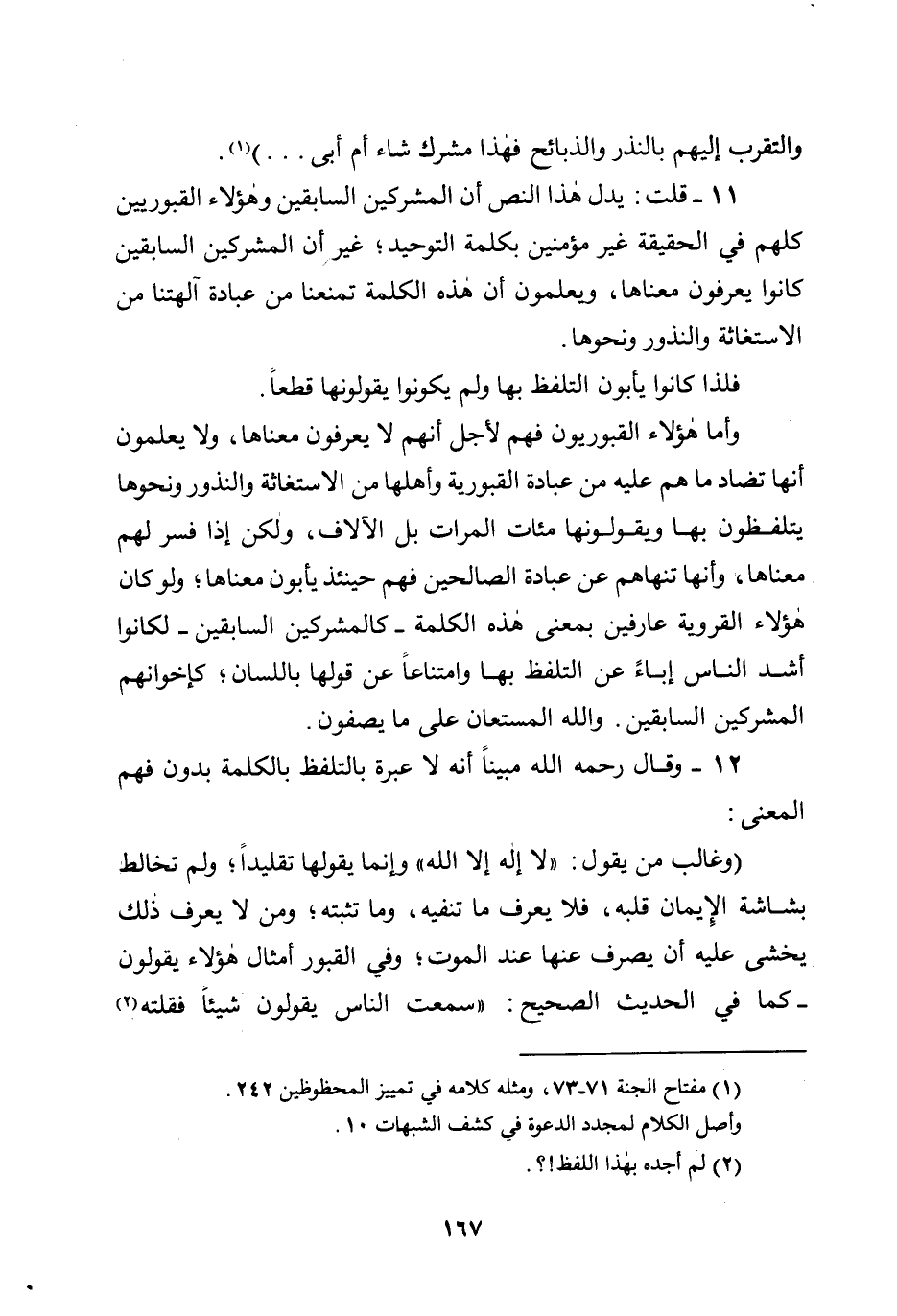 11 - قلت: يدل هذا النص أن المشركين السابقين وهؤلاء القبوريين كلهم في الحقيقة غير مؤمنين بكلمة التوحيد؛ غير أن المشركين السابقين كانوا يعرفون معناها، ويعلمون أن هذه الكلمة تمنعنا من عبادة آلهتنا من الاستغاثة والنذور ونحوها.