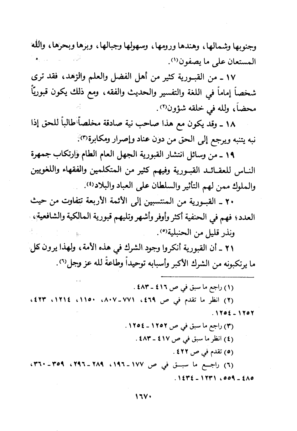17 - من القبورية كثير من أهل الفضل والعلم والزهد، فقد ترى شخصاً إماماً في اللغة والتفسير والحديث والفقه، ومع ذلك يكون قبورياً محضاً، ولله في خلقه شئون.
