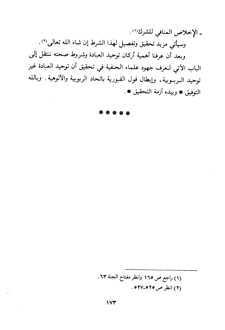 وبعد أن عرفنا أهمية أركان توحيد العبادة وشروط صحته ننتقل إلى الباب الآتي لنعرف جهود علماء الحنفية في تحقيق أن توحيد العبادة غير توحيد الربوبية، وإبطال قول القبورية باتحاد الربوبية والألوهية. وبالله التوفيق * وبيده أزمة التحقيق *.