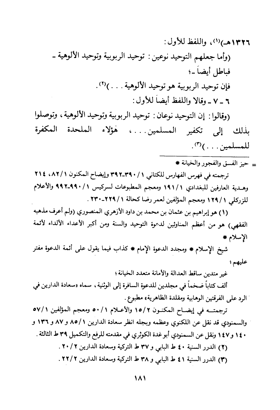 (وقالوا: إن التوحيد نوعان: توحيد الربوبية وتوحيد الألوهية، وتوصلوا بذلك إلى تكفير المسلمين....، هؤلاء الملحدة المكفرة للمسلمين....) .