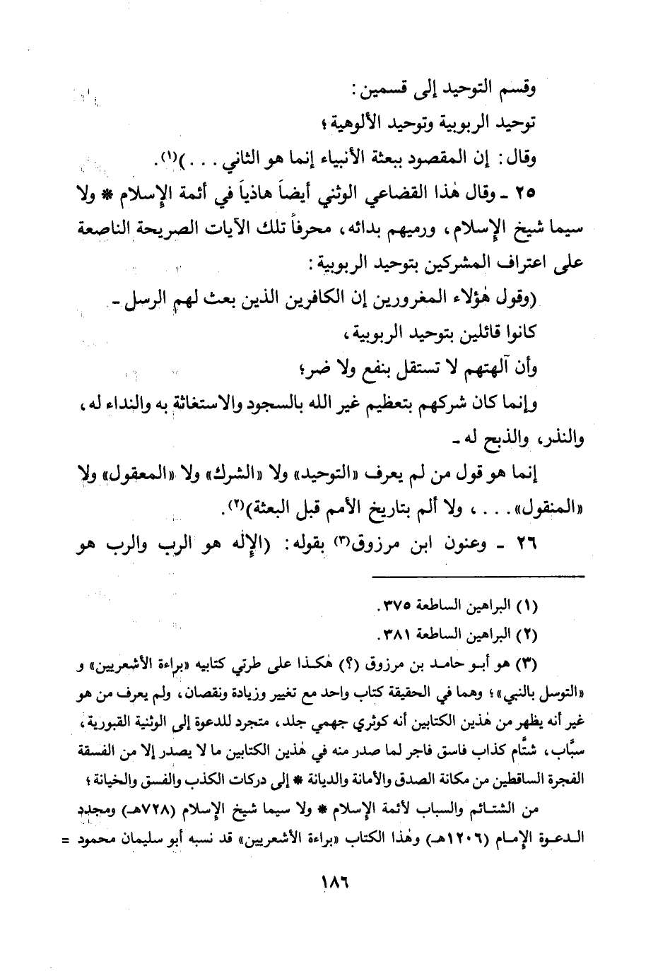 (وقول هؤلاء المغرورين إن الكافرين الذين بعث لهم الرسل - كانوا قائلين بتوحيد الربوبية، وأن آلهتهم لا تستقل بنفع ولا ضر؛ وإنما كان شركهم بتعظيم غير الله بالسجود والاستغاثة به والنداء له، والنذر، والذبح له - إنما هو قول من لم يعرف ((التوحيد)) ولا ((الشرك)) ولا ((المعقول)) ولا ((المنقول)) ....، ولا ألم بتاريخ الأمم قبل البعثة) .