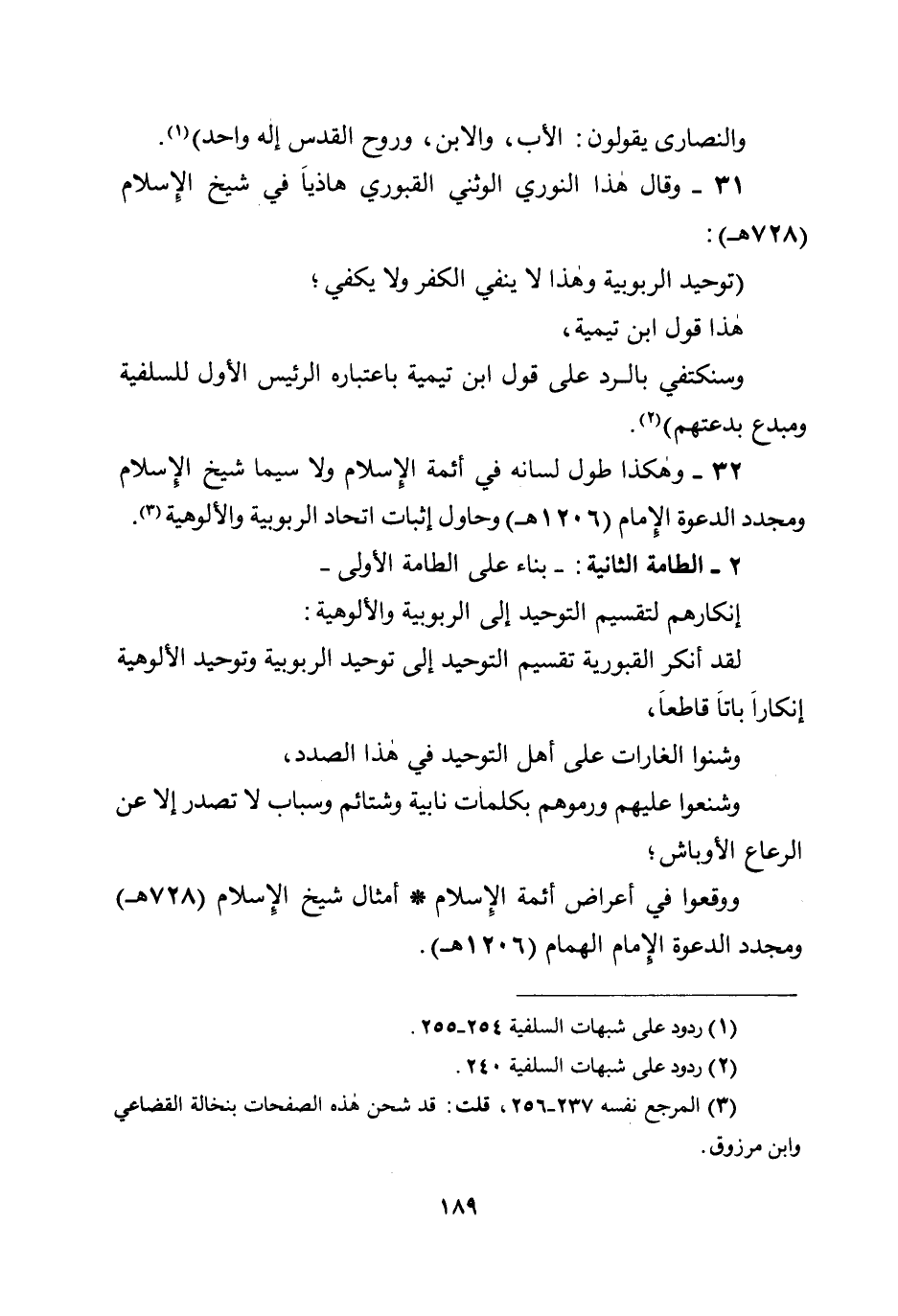 32- وهكذا طول لسانه في أئمة الإسلام ولا سيما شيخ الإسلام ومجدد الدعوة الإمام (1206هـ) وحاول إثبات اتحاد الربوبية والألوهية.