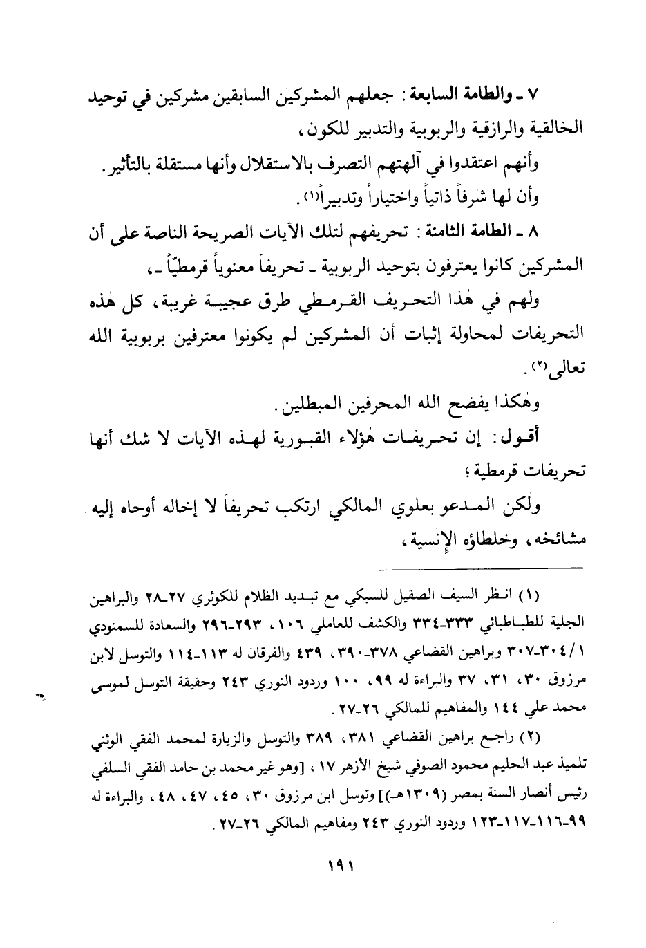 8 - الطامة الثامنة: تحريفهم لتلك الآيات الصريحة الناصة على أن المشركين كانوا يعترفون بتوحيد الربوبية - تحريفًا معنويا قرمطيا -، ولهم في هذا التحريف القرمطي طرق عجيبة غريبة، كل هذه التحريفات لمحاولة إثبات أن المشركين لم يكونوا معترفين بربوبية الله تعالى.