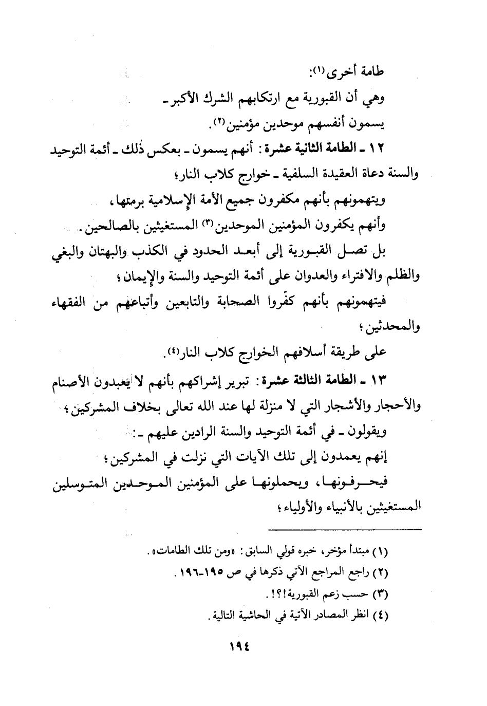 12 - الطامة الثانية عشرة: أنهم يسمون - بعكس ذلك - أئمة التوحيد والسنة دعاة العقيدة السلفية - خوارج كلاب النار؛ ويتهمونهم بأنهم مكفرون جميع الأمة الإسلامية برمتها، وأنهم يكفرون المؤمنين الموحدين المستغيثين بالصالحين.