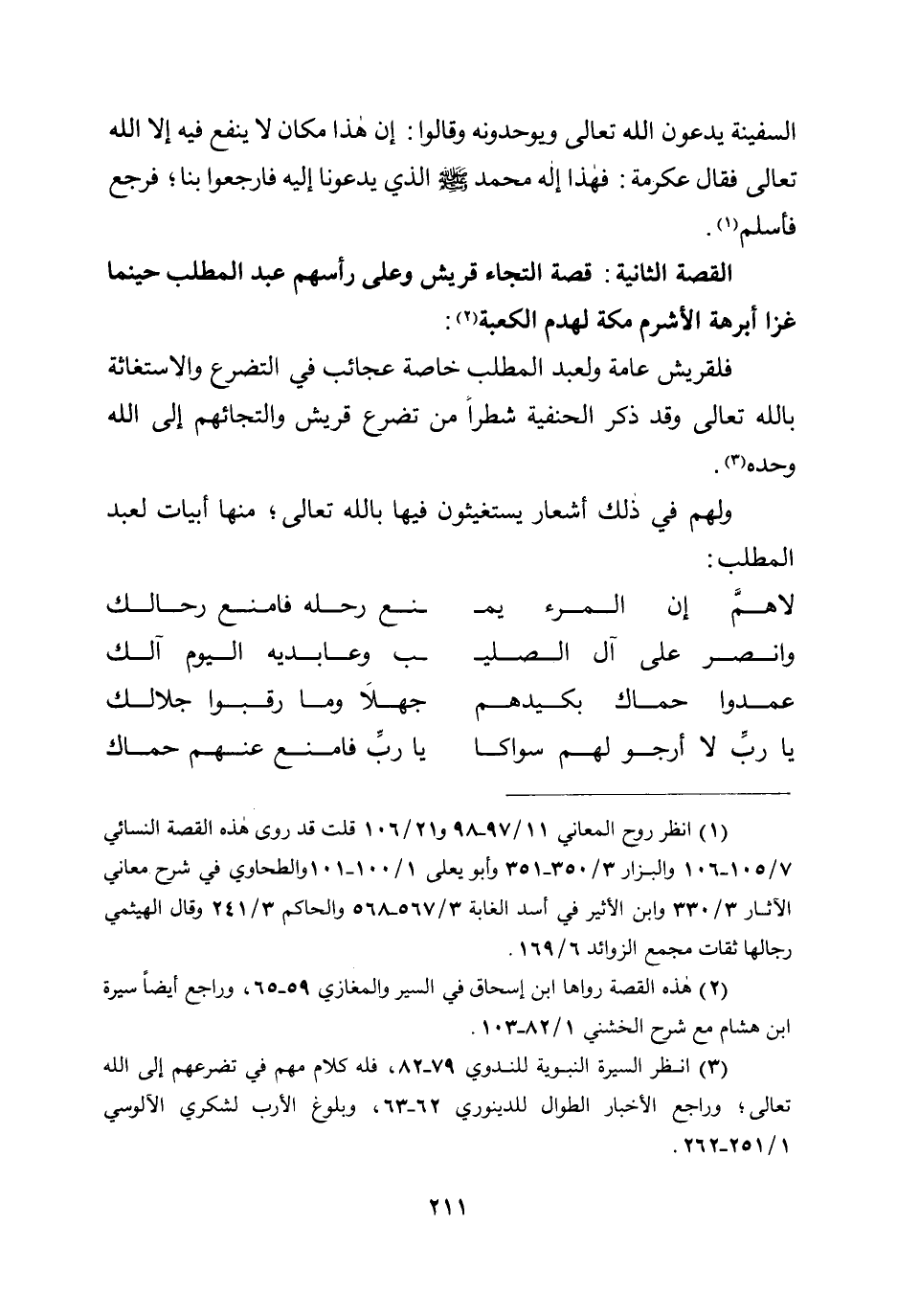 فلقريش عامة ولعبد المطلب خاصة عجائب في التضرع والاستغاثة بالله تعالى وقد ذكر الحنفية شطرًا من تضرع قريش والتجائهم إلى الله وحده.