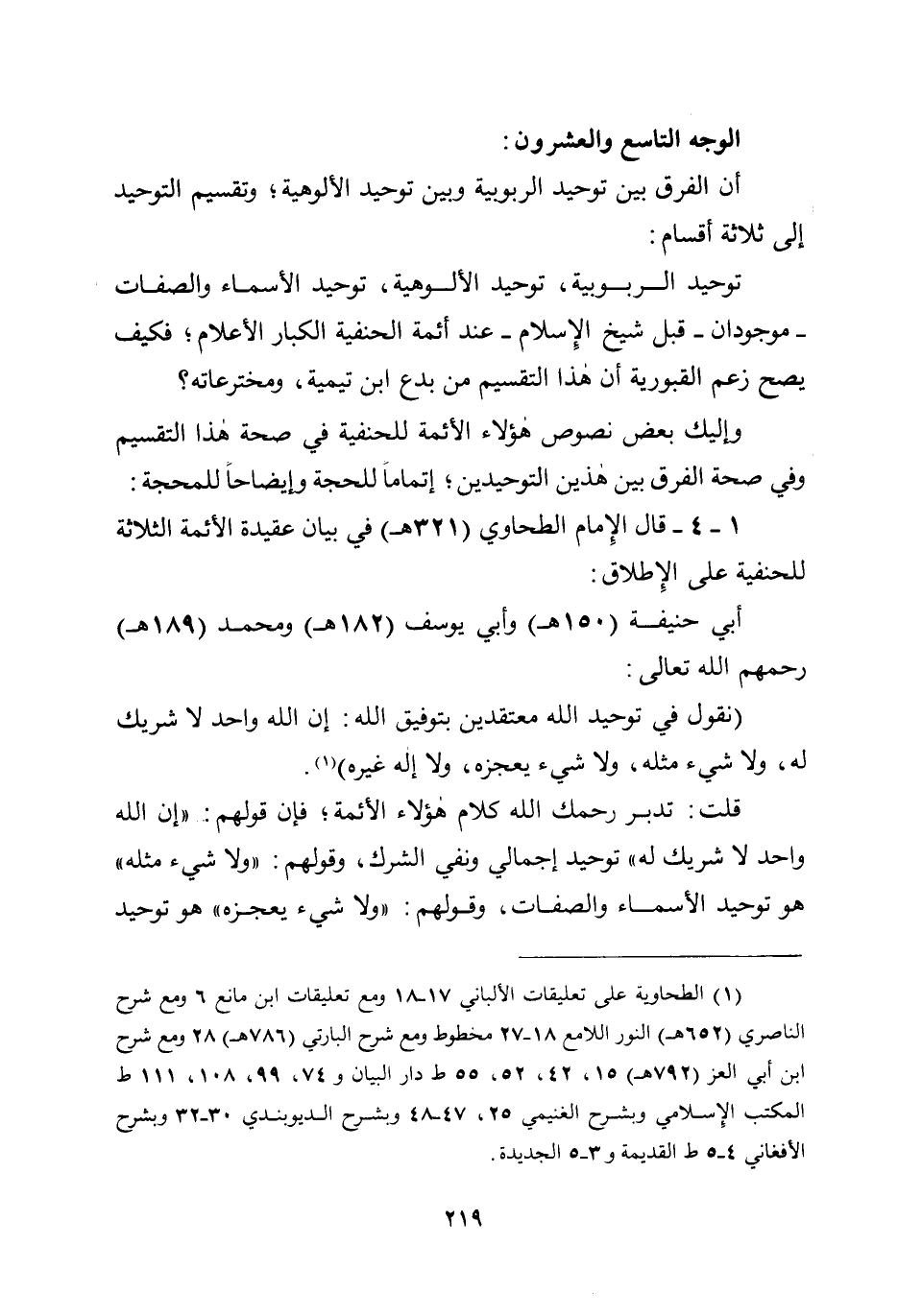 وإليك بعض نصوص هؤلاء الأئمة للحنفية في صحة هذا التقسيم وفي صحة الفرق بين هذين التوحيدين؛ إتمامًا للحجة وإيضاحًا للمحجة:
