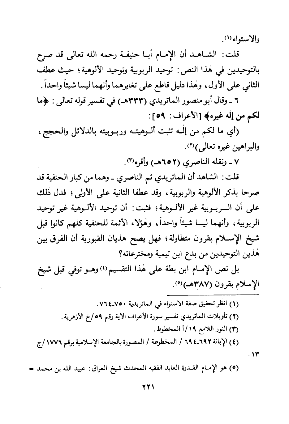 قلت: الشاهد أن الماتريدي ثم الناصري - وهما من كبار الحنفية قد صرحا بذكر الألوهية والربوبية، وقد عطفا الثانية على الأولى؛ فدل ذلك على أن الربوبية غير الألوهية؛ فثبت: أن توحيد الألوهية غير توحيد الربوبية، وأنهما ليسا شيئًا واحدًا، وهؤلاء الأئمة للحنفية كلهم كانوا قبل شيخ الإسلام بقرون متطاولة؛ فهل يصح هذيان القبورية أن الفرق بين هذين التوحيدين من بدع ابن تيمية ومخترعاته؟