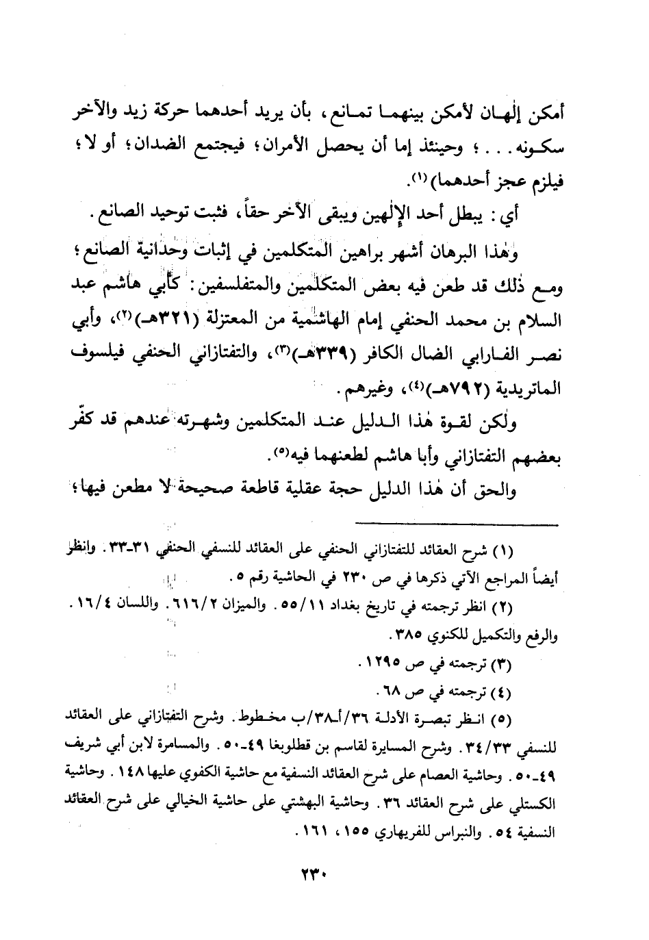 وهذا البرهان أشهر براهين المتكلمين في إثبات وحدانية الصانع؛ ومع ذلك قد طعن فيه بعض المتكلمين والمتفلسفين: كأبي هاشم عبد السلام بن محمد الحنفي إمام الهاشمية من المعتزلة (321هـ) ، وأبي نصر الفارابي الضال الكافر (339هـ) ، والتفتازاني الحنفي فيلسوف الماتريدية (792هـ) ، وغيرهم.