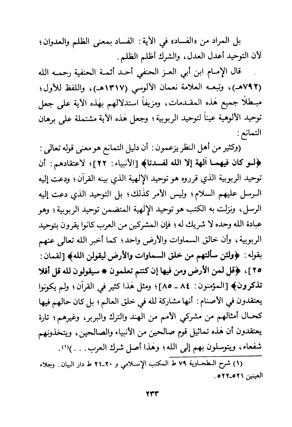 قال الإمام ابن أبي العز الحنفي أحد أئمة الحنفية رحمه الله (792هـ) ، وتبعه العلامة نعمان الآلوسي (1317هـ) ، واللفظ للأول؛ مبطلًا جميع هذه المقدمات، ومزيفًا استدلالهم بهذه الآية على جعل توحيد الألوهية عينًا لتوحيد الربوبية؛ وجعل هذه الآية مشتملة على برهان التمانع: