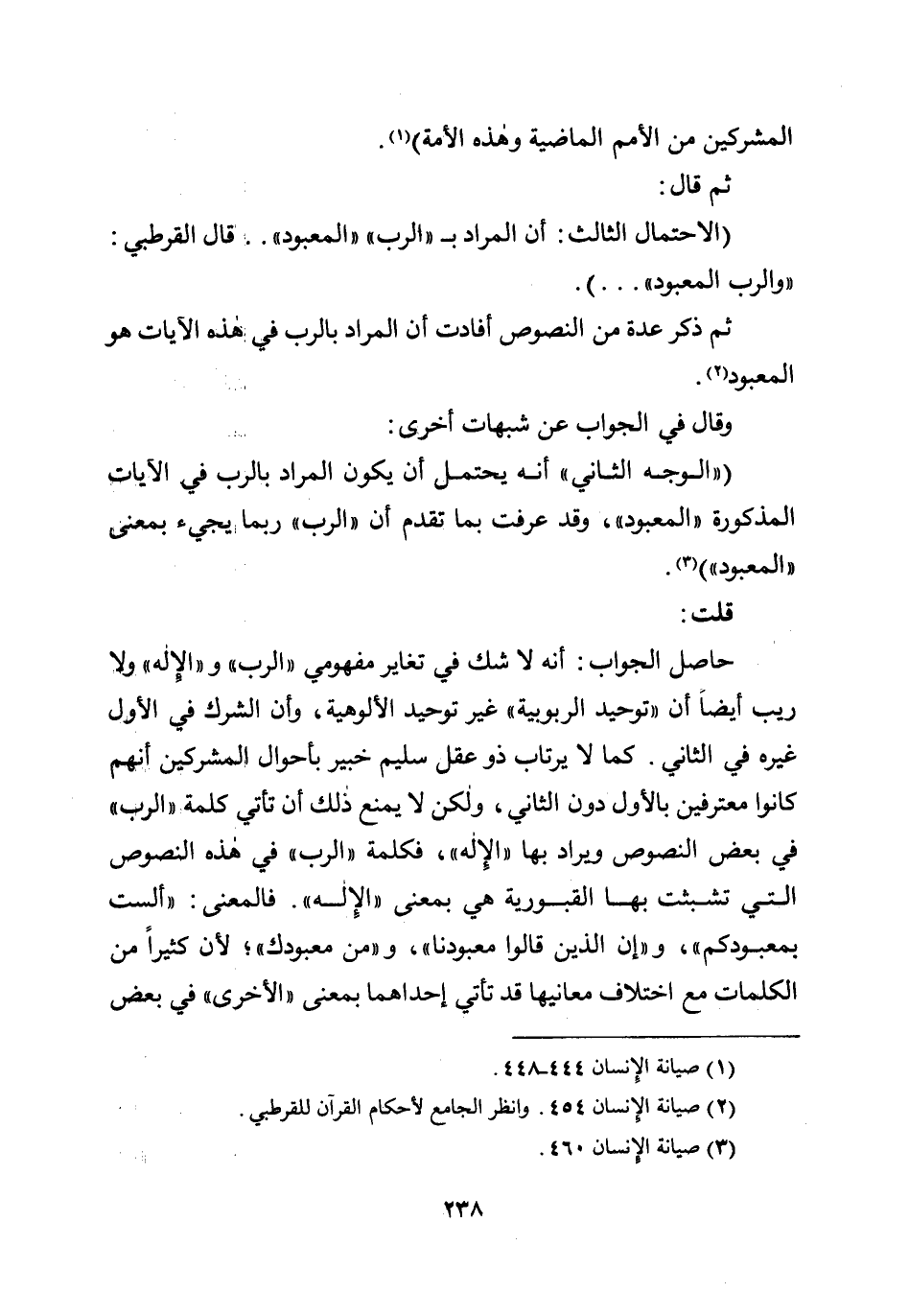 (الاحتمال الثالث: أن المراد بـ ((الرب)) ((المعبود)) ..... قال القرطبي: ((والرب المعبود)) ....) .
