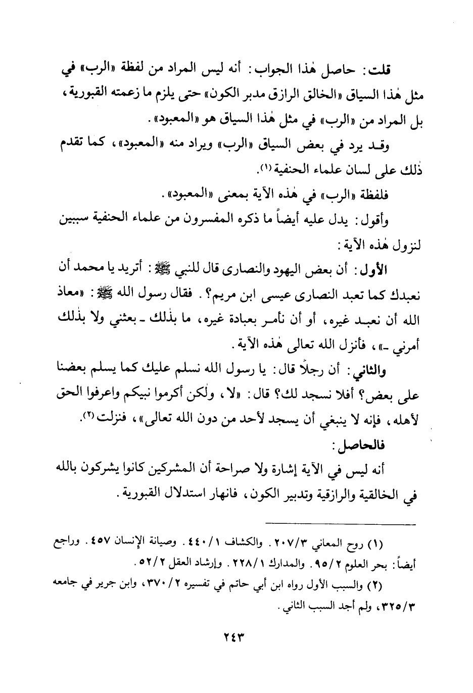 قلت: حاصل هذا الجواب: أنه ليس المراد من لفظة ((الرب)) في مثل هذا السياق ((الخالق الرازق مدبر الكون)) حتى يلزم ما زعمته القبورية، بل المراد من ((الرب)) في مثل هذا السياق هو ((المعبود)) .