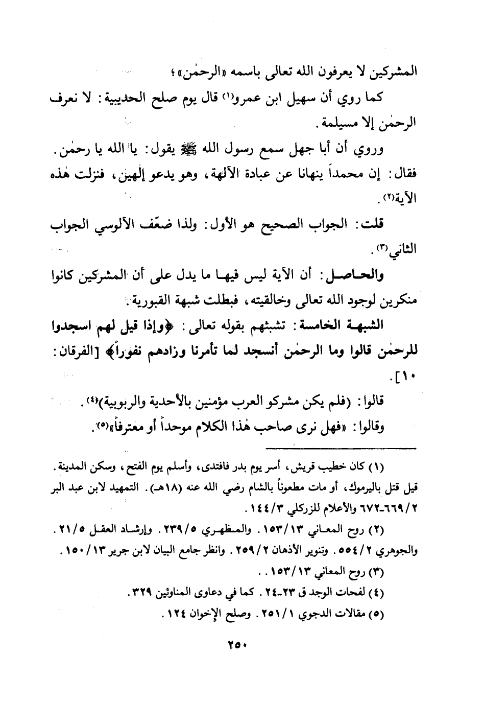 الشبهة الخامسة: تشبثهم بقوله تعالى: {وَإِذَا قِيلَ لَهُمُ اسْجُدُوا لِلرَّحْمَنِ قَالُوا وَمَا الرَّحْمَنُ أَنَسْجُدُ لِمَا تَأْمُرُنَا وَزَادَهُمْ نُفُورًا} [الفرقان: 10] .