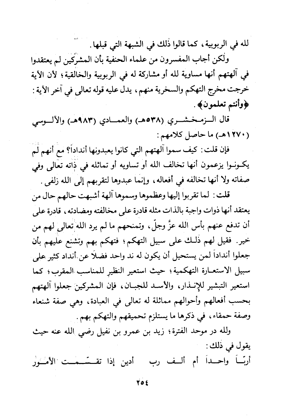 فإن قلت: كيف سموا آلهتهم التي كانوا يعبدونها أندادًا؟ مع أنهم لم يكونوا يزعمون أنها تخالف الله أو تساويه أو تماثله في ذاته تعالى وفي صفاته ولا أنها تخالفه في أفعاله، وإنما عبدوها لتقربهم إلى الله زلفى.