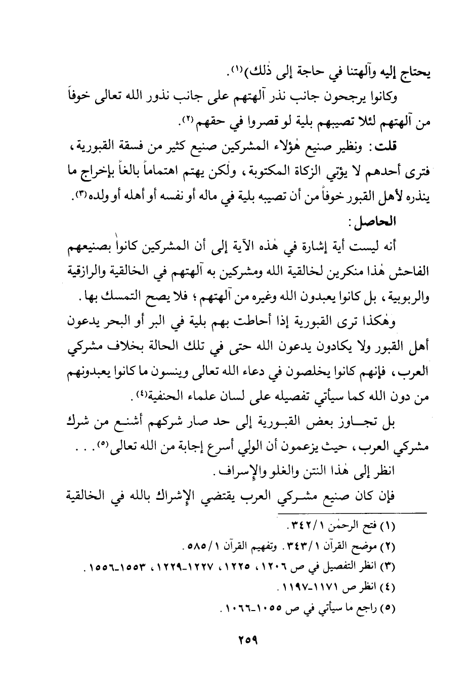 وهكذا ترى القبورية إذا أحاطت بهم بلية في البر أو البحر يدعون أهل القبور ولا يكادون يدعون الله حتى في تلك الحالة بخلاف مشركي العرب، فإنهم كانوا يخلصون في دعاء الله تعالى وينسون ما كانوا يعبدونهم من دون الله كما سيأتي تفصيله على لسان علماء الحنفية.