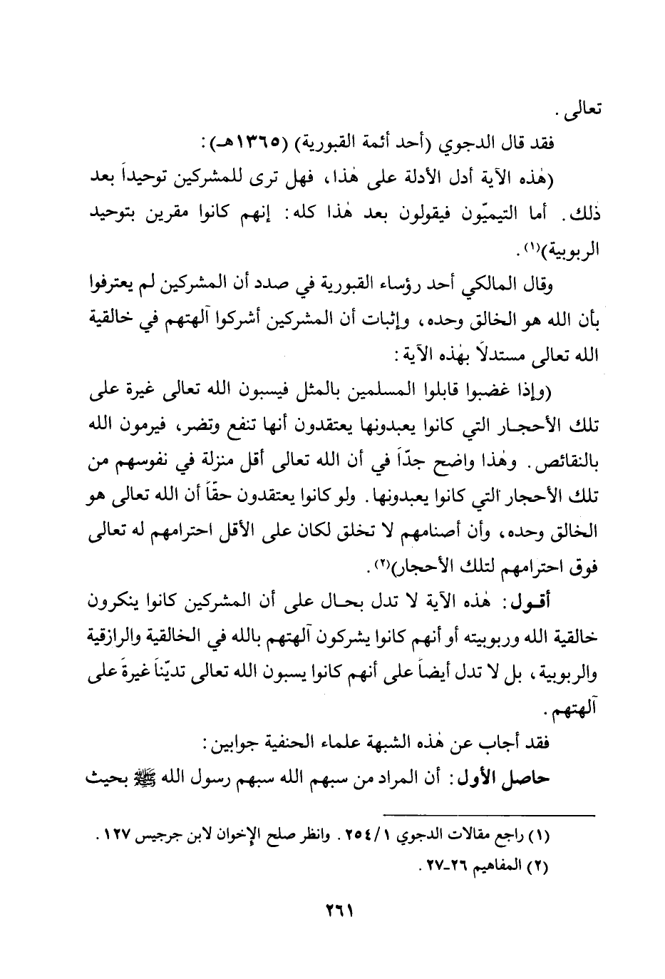 (وإذا غضبوا قابلوا المسلمين بالمثل فيسبون الله تعالى غيرة على تلك الأحجار التي كانوا يعبدونها يعتقدون أنها تنفع وتضر، فيرمون الله بالنقائص. وهذا واضح جدا في أن الله تعالى أقل منزلة في نفوسهم من تلك الأحجار التي كانوا يعبدونها. ولو كانوا يعتقدون حقا أن الله تعالى هو الخالق وحده، وأن أصنامهم لا تخلق لكان على الأقل احترامهم له تعالى فوق احترامهم لتلك الأحجار) .