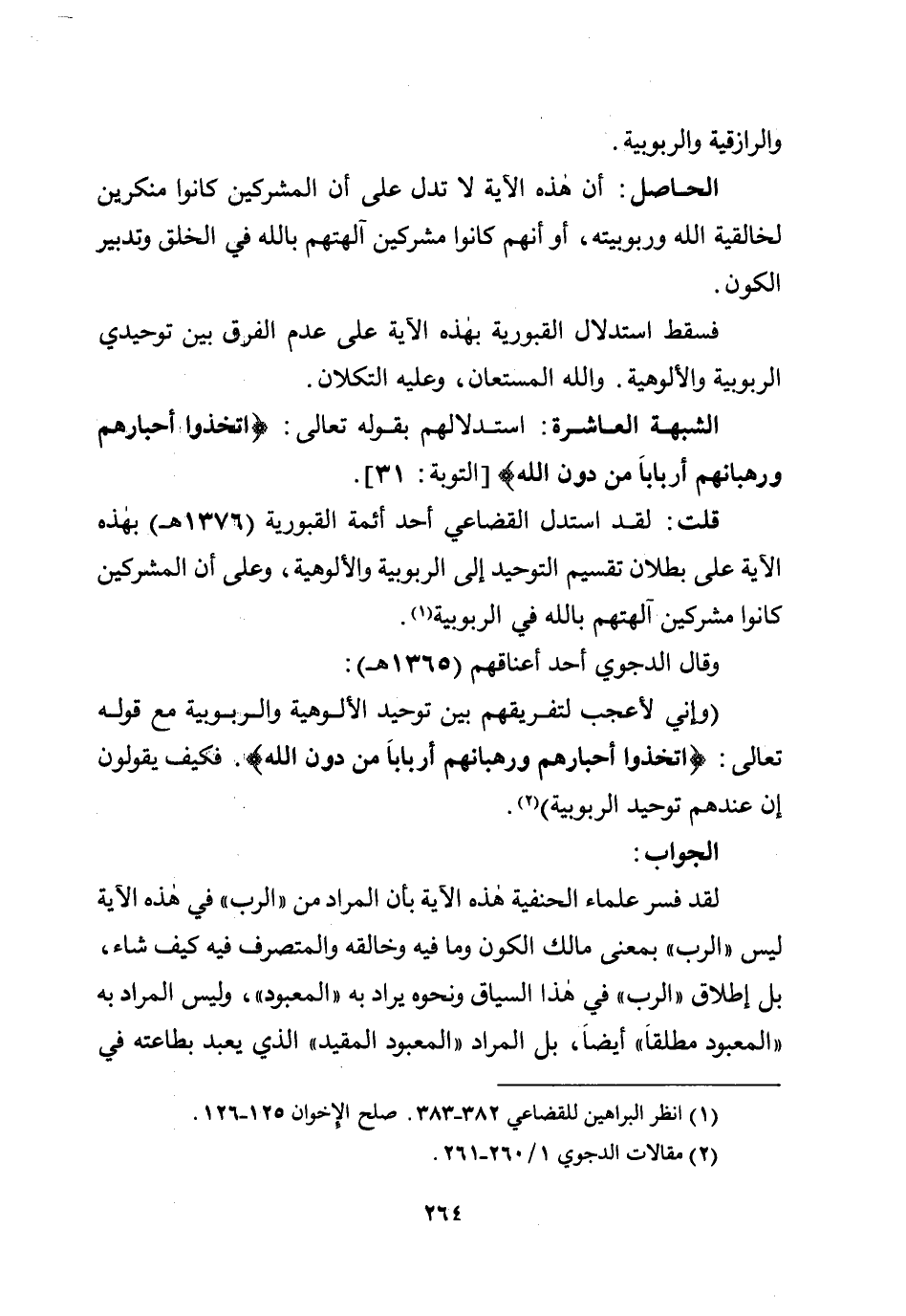 (وإني لأعجب لتفريقهم بين توحيد الألوهية والربوبية مع قوله تعالى: {اتَّخَذُوا أَحْبَارَهُمْ وَرُهْبَانَهُمْ أَرْبَابًا مِنْ دُونِ اللَّهِ} فكيف يقولون إن عندهم توحيد الربوبية) .