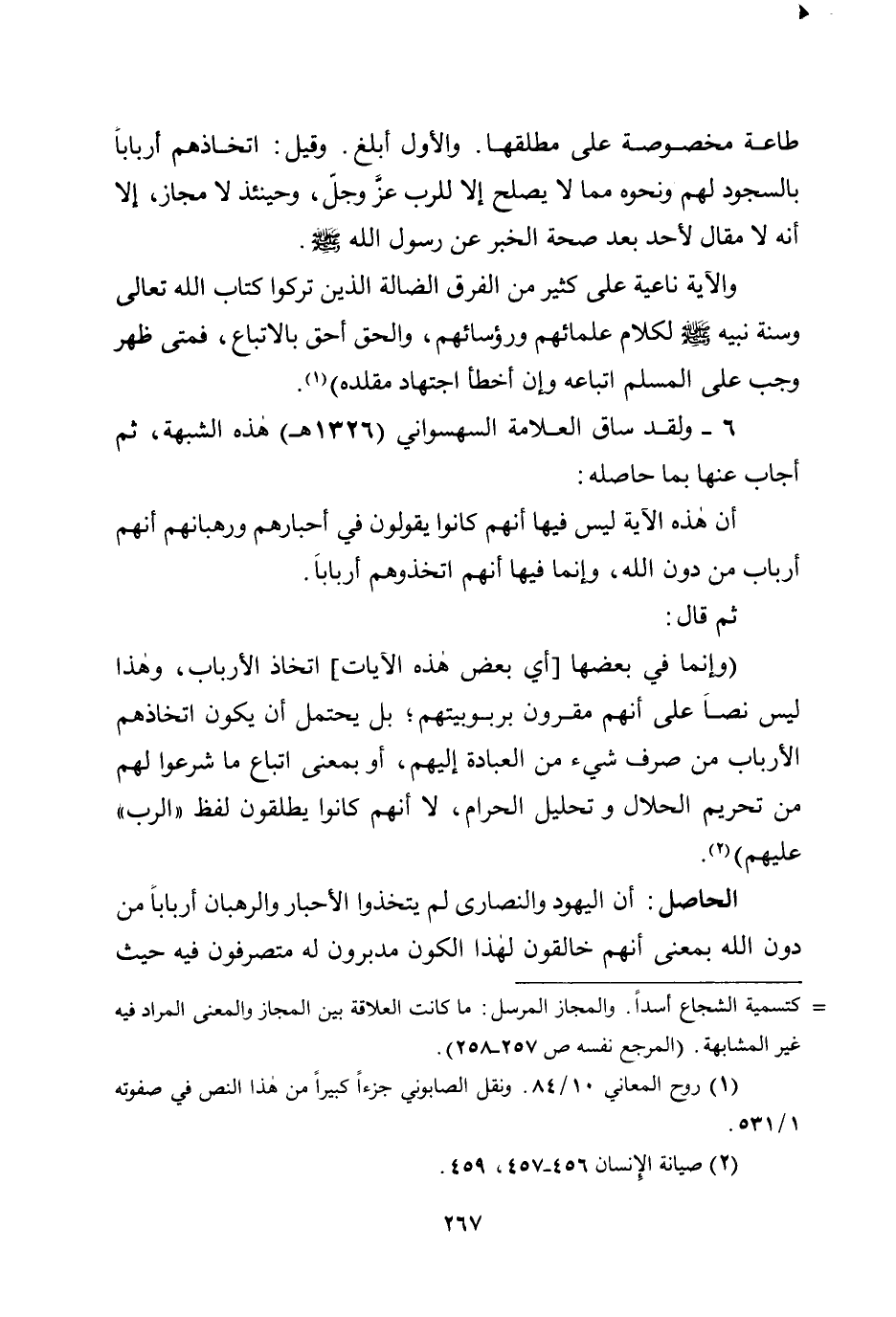 (وإنما في بعضها [أي بعض هذه الآيات] اتخاذ الأرباب، وهذا ليس نصا على أنهم مقرون بربوبيتهم؛ بل يحتمل أن يكون اتخاذهم الأرباب من صرف شيء من العبادة إليهم، أو بمعنى اتباع ما شرعوا لهم من تحريم الحلال وتحليل الحرام، لا أنهم كانوا يطلقون لفظ ((الرب)) عليهم) .